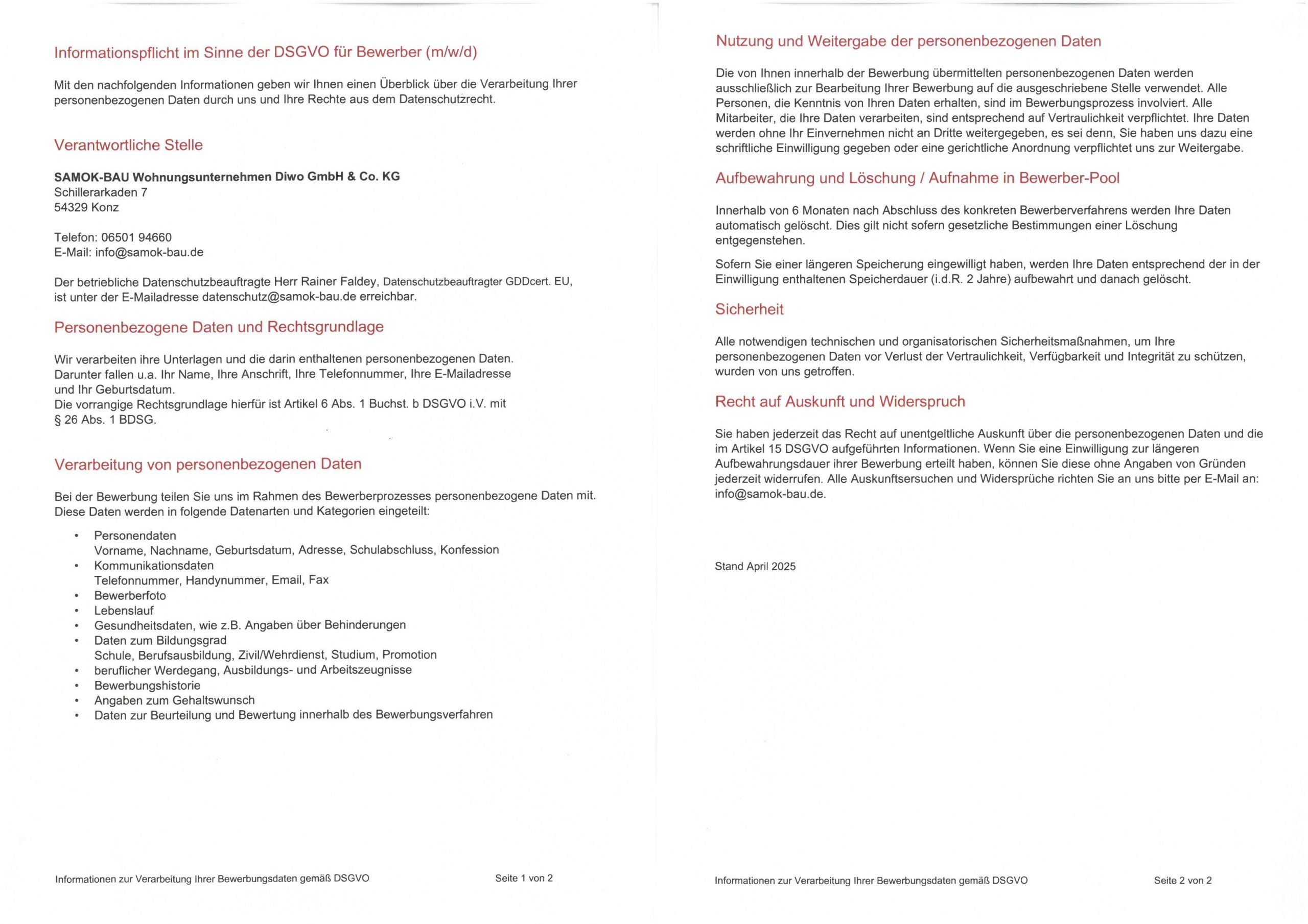 Informationspflichten für Bewerber im Sinne der DSGVO (Datenschutzgrundverordnung)